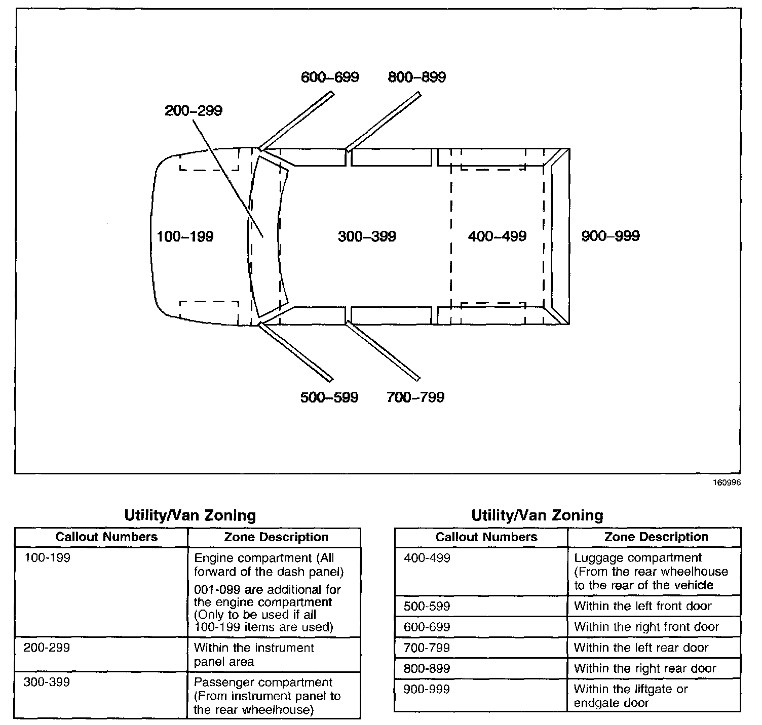 All grounds, in-line connectors, pass-through grommets, and splices have identifying numbers that correspond to where they are located in the vehicle. The following table explains the numbering system.