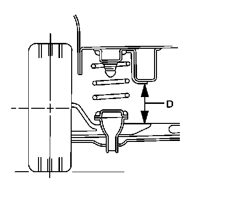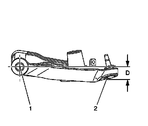 ^ The D dimension for all wheel drive vehicles is the vertical distance measured between the horizontal centerline of the lower control arm bolt (1) and the bottom of the ball joint (2).