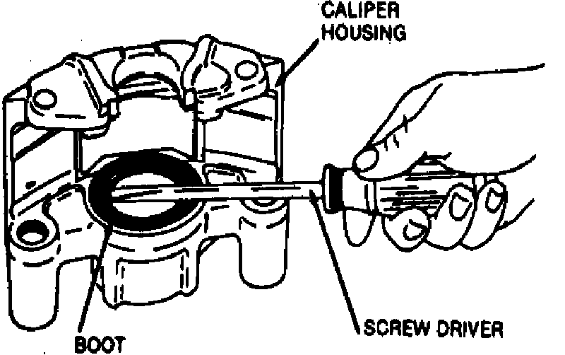 4. Using a piece of wood or plastic, remove piston seal from groove in caliper bore. Do not use any type of metal tool to remove piston seal, since damage to caliper bore may result.