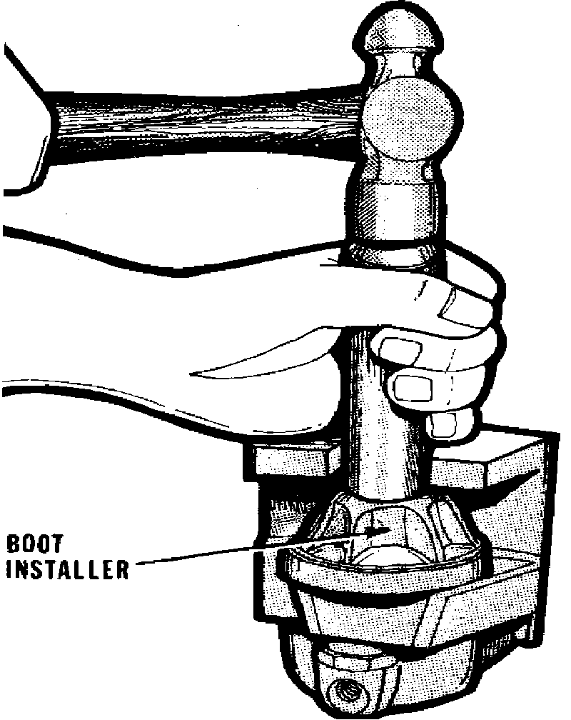 4. Position outside diameter of boot into caliper counterbore and seat with suitable boot installer. Fig. 7. Ensure that retaining ring molded into boot is not bent and that boot is installed fully and evenly below and around the caliper, as dirt and moisture may enter caliper and cause damage and corrosion.