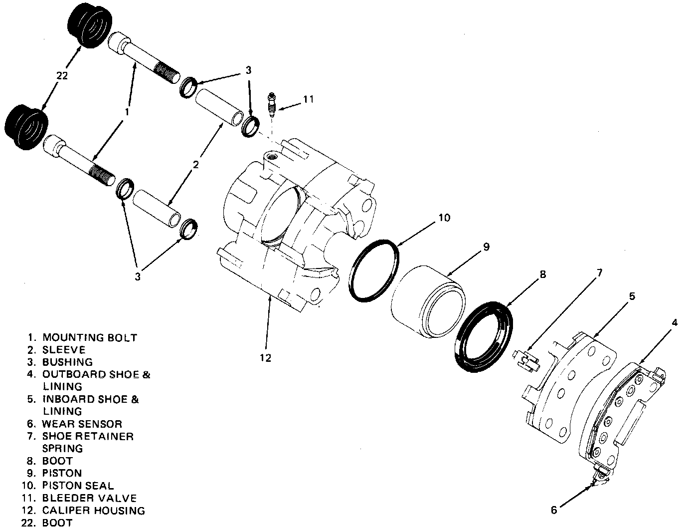 6. Check clearance between caliper (10) and stops on the bracket (12). Clearance should be 0.13 to 0.30 mm (0.005 to 0.012 inch).