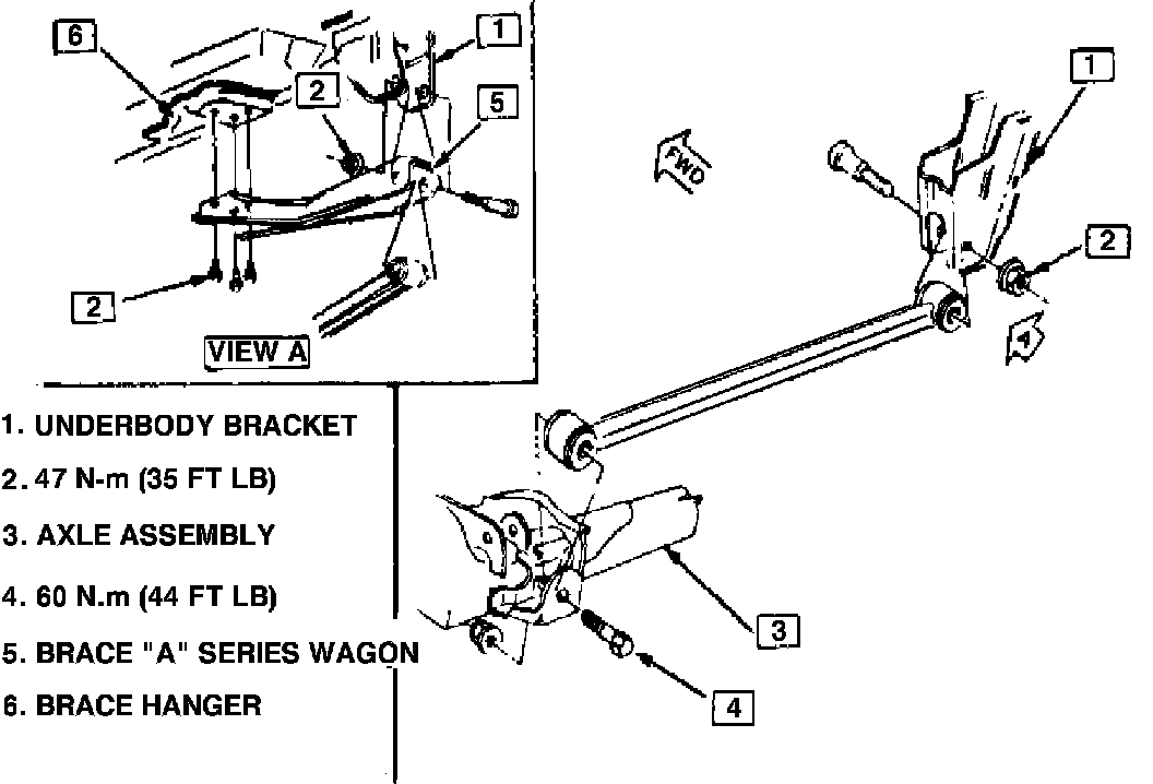 3. Reverse procedure to install, Fig. 6. Open side of track bar must face rear of vehicle. Also, nut must be at rear of attachments at both axle and underbody attachments.