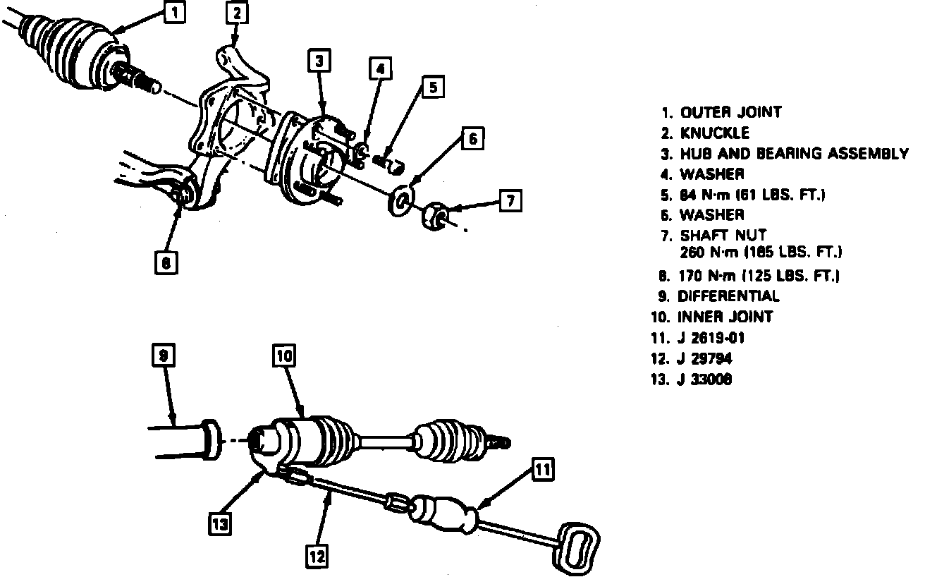 10. Using drive axle removal tool No. J 33008, slide hammer tool J 2619-01 and axle shaft remover extension tool No. J 29794 or equivalents, remove axle shaft from differential.