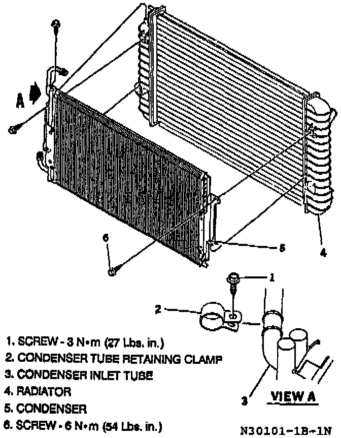 6. Condenser inlet line and retaining clamp on radiator side tank. Discard 0-ring seals.