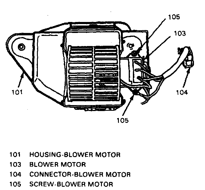 8. Blower motor electrical connector (104) and two screws (102) from blower motor housing (101).