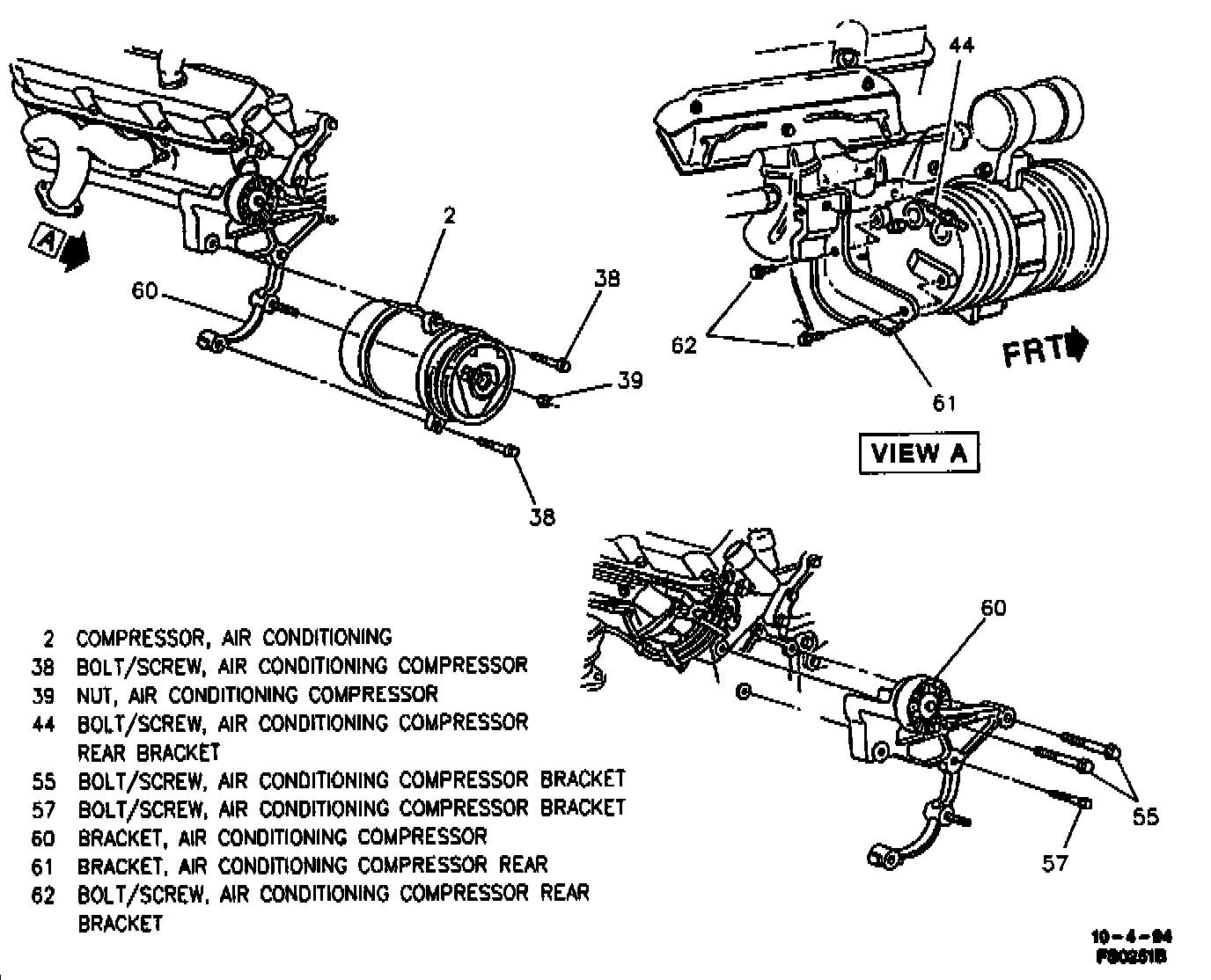 11. Bolts/screws (38) mounting A/C compressor front bracket (60).