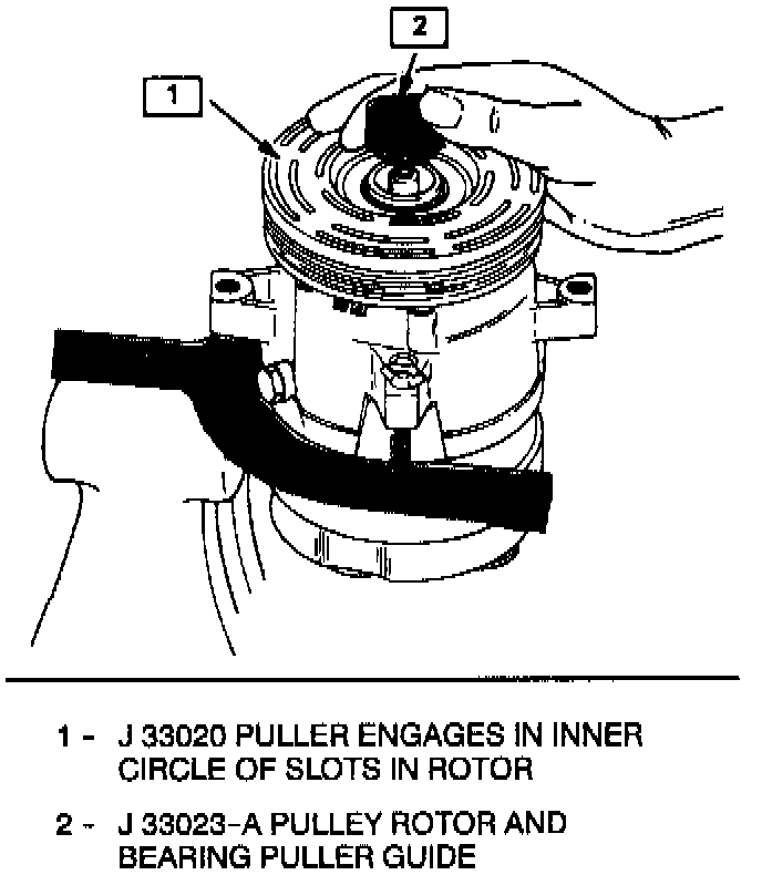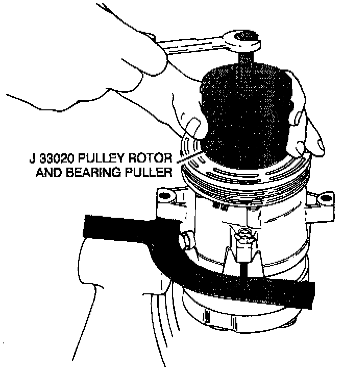 4. Hold the J 33020 puller in place and tighten the puller screw against the puller guide to remove the pulley rotor and bearing assembly.