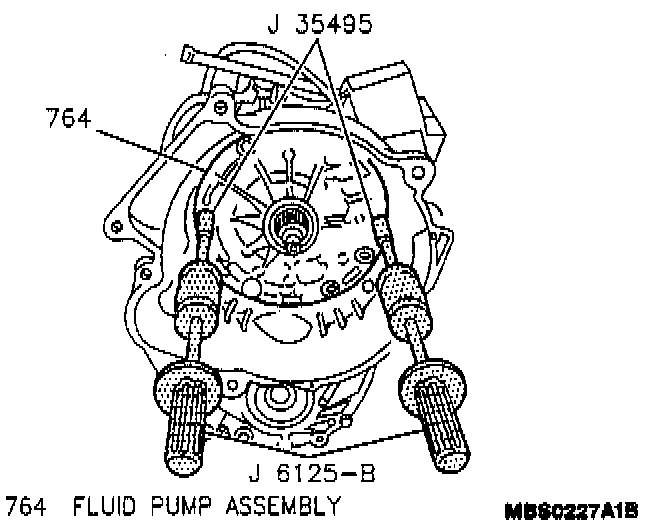 2. Thread a J 35495 and J 6125-B into both sides of the pump body, one on either side directly across from each other, and gently tap outwards on both sides at the same time with both slide hammers until the fluid pump is free of the transaxle case. Use caution not to drop the input shaft bearing and/or race which may sometimes adhere to the rear of the pump.