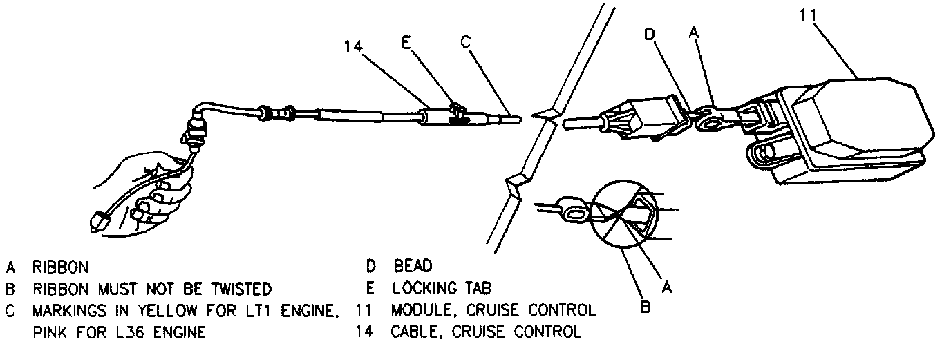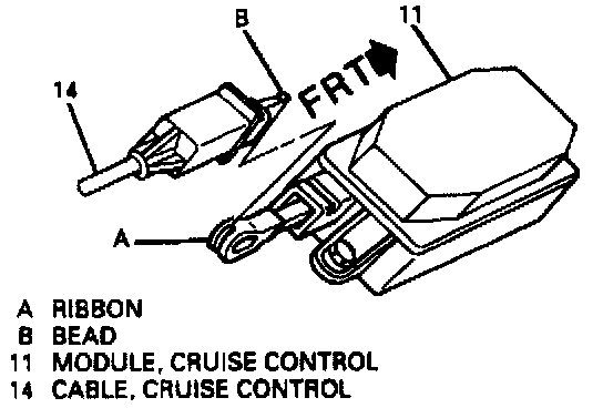 The cable (14) is connected between the cruise control module (11) and the throttle body lever, or accelerator control/cruise control servo cable adjuster, if equipped.