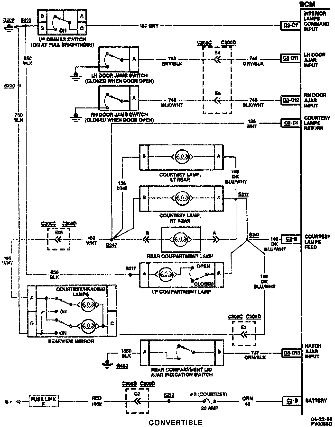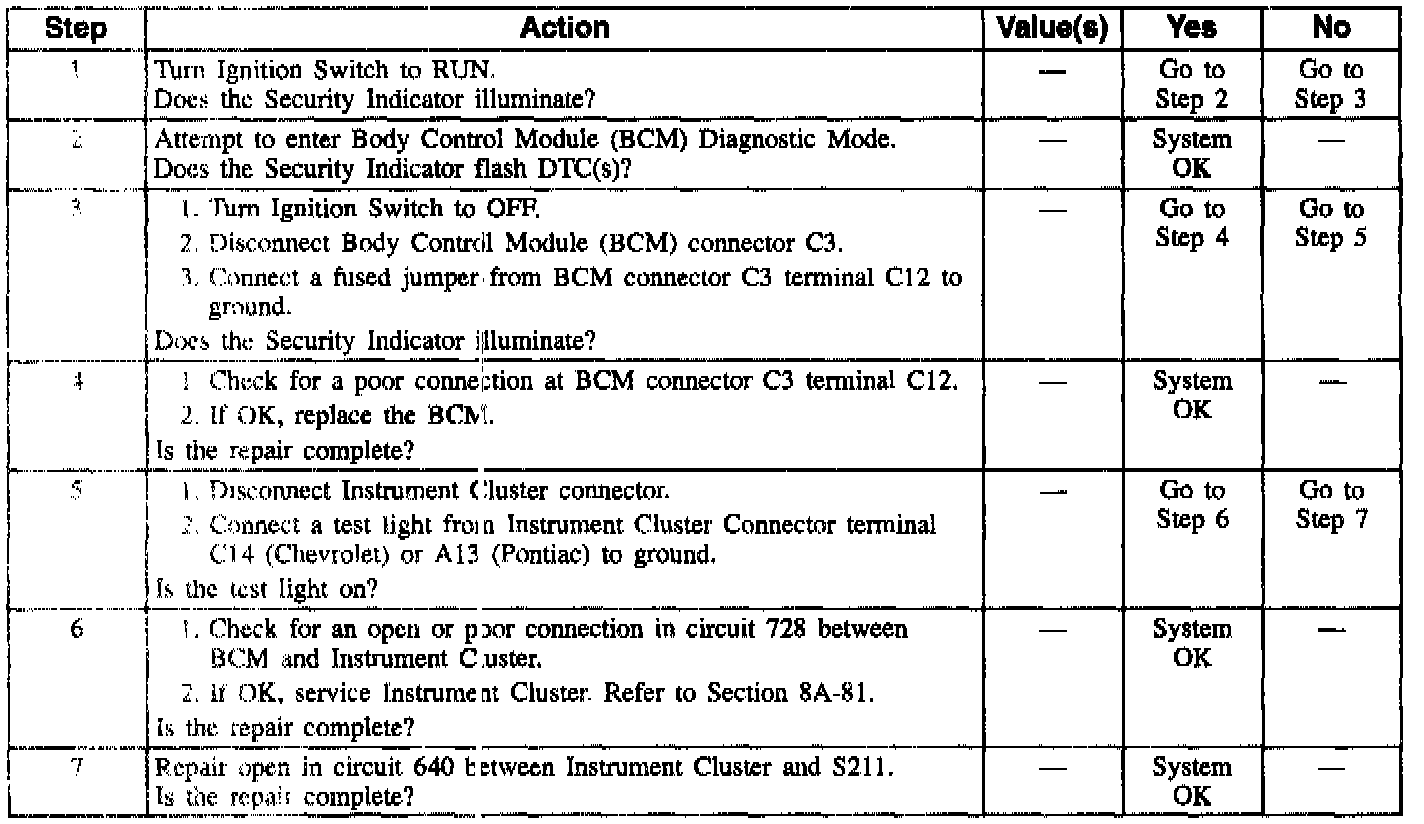 Voltage is applied at all times from POWER ACC Fuse 7 and circuit 640 to the "SECURITY" indicator lamp on the Instrument Cluster. With the Ignition Switch in the "BULB TEST" or "RUN" position, ground is applied by the BCM through circuit 728 to the "SECURITY" indicator lamp. The "SECURITY" indicator lamp illuminates for approximately 5 seconds to verify circuit operation.