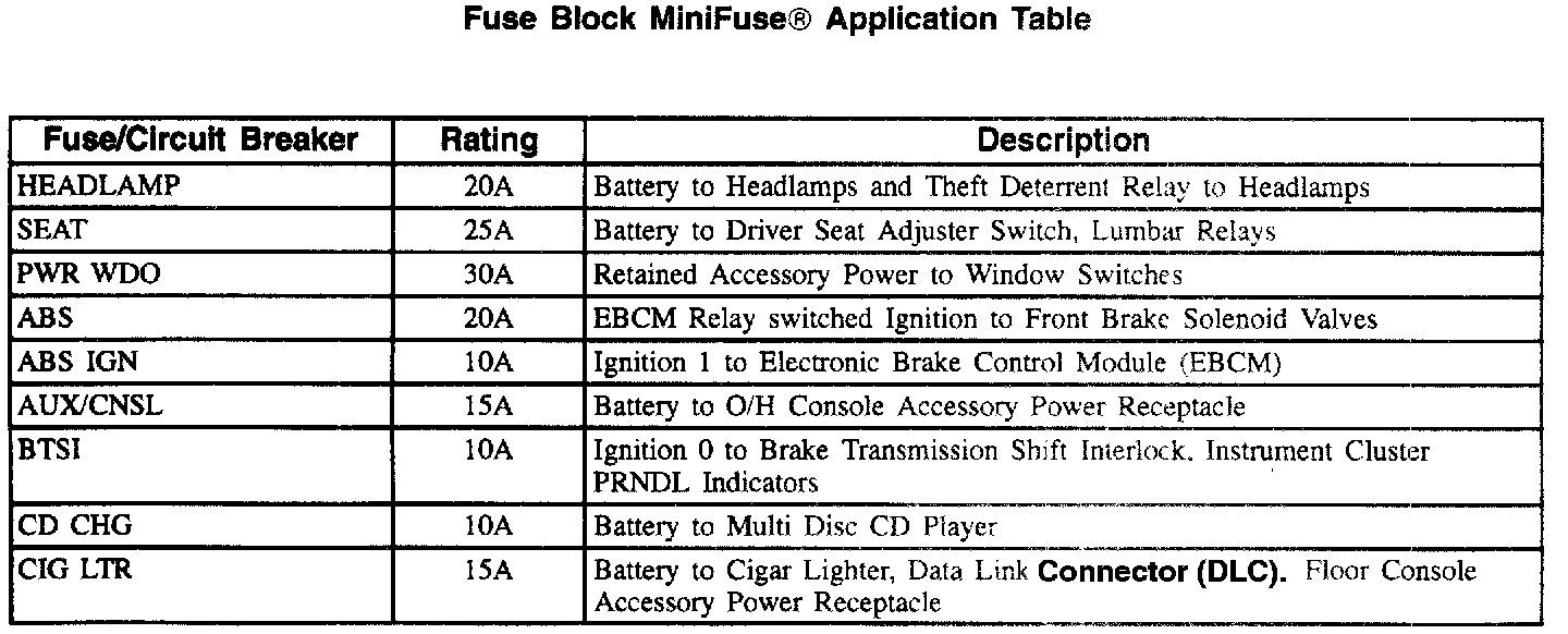 Fuse Block Mini Fuse Application Table (Part 1 Of 2):