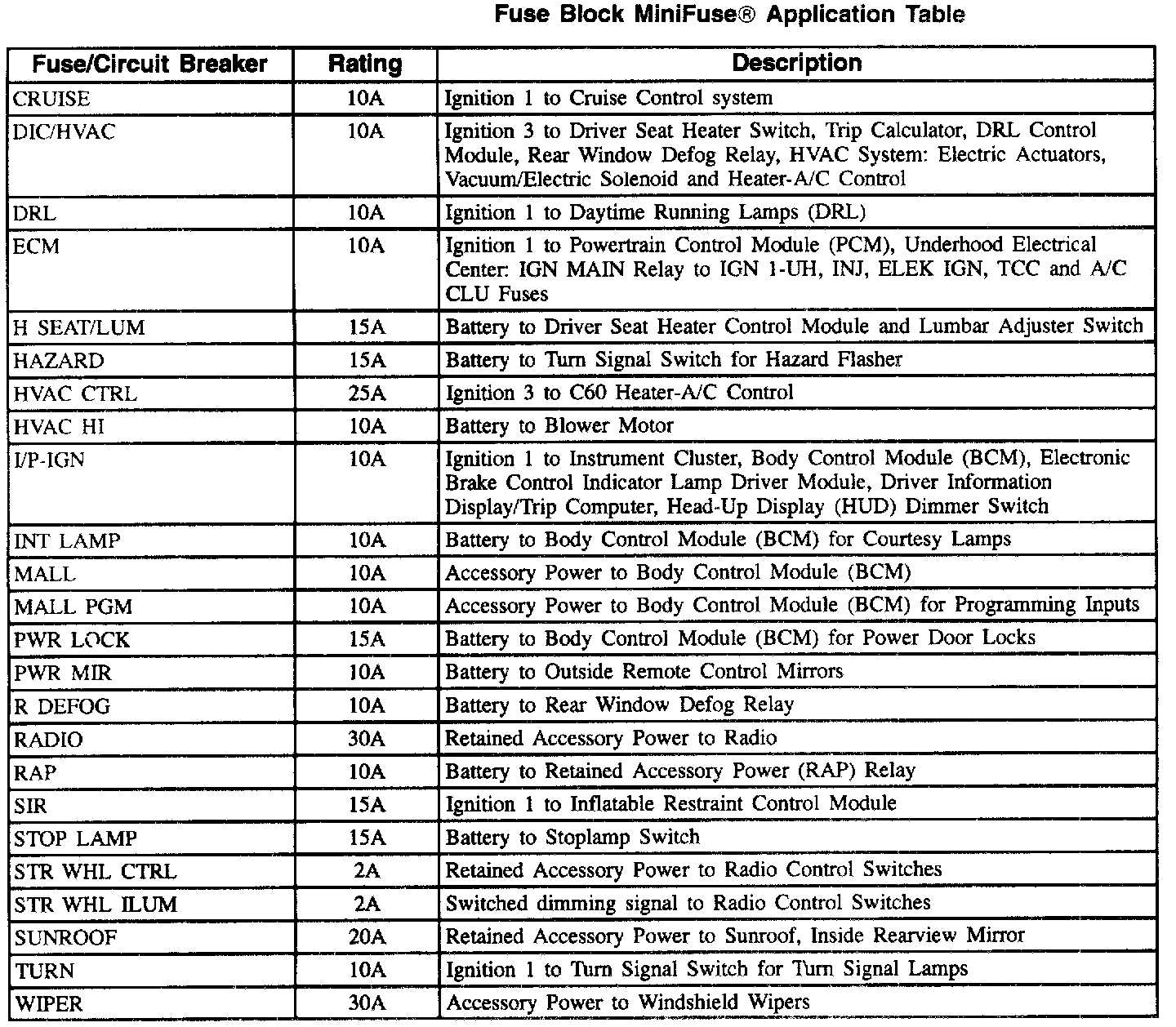 Fuse Block Mini Fuse Application Table (Part 2 Of 2):