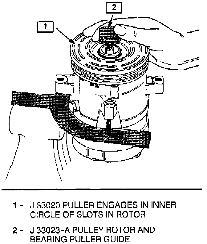 4. Hold the J 33020 puller in place and tighten the puller screw against the puller guide to remove the pulley rotor and bearing assembly.