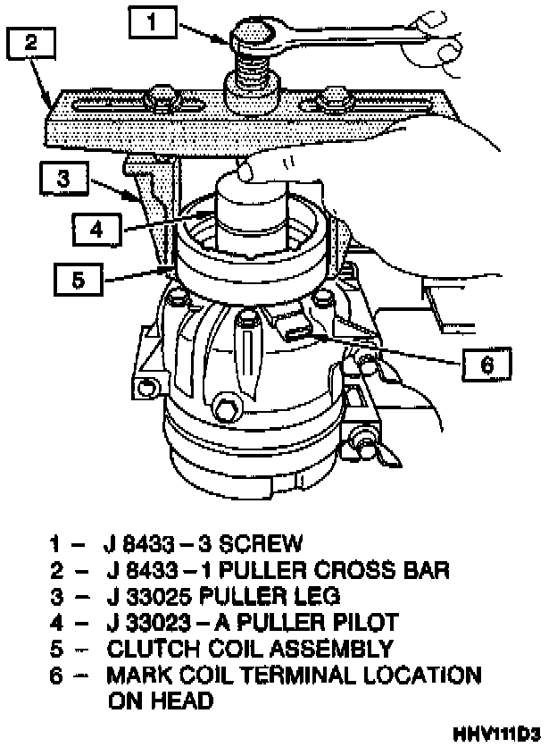 1. Perform Steps 1 through 4 of Clutch Rotor and/or Bearings" removal procedure. Mark clutch coil terminal location on compressor front head.