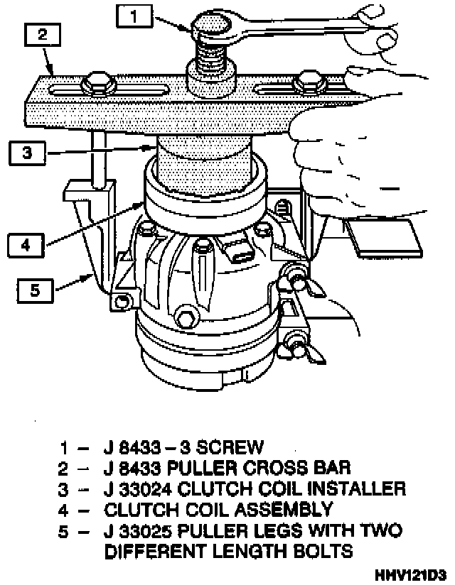 2. Install J 33023-A puller pilot on front head of compressor. Also install J 8433-1 puller crossbar with J 33025 puller legs as shown in the illustration.