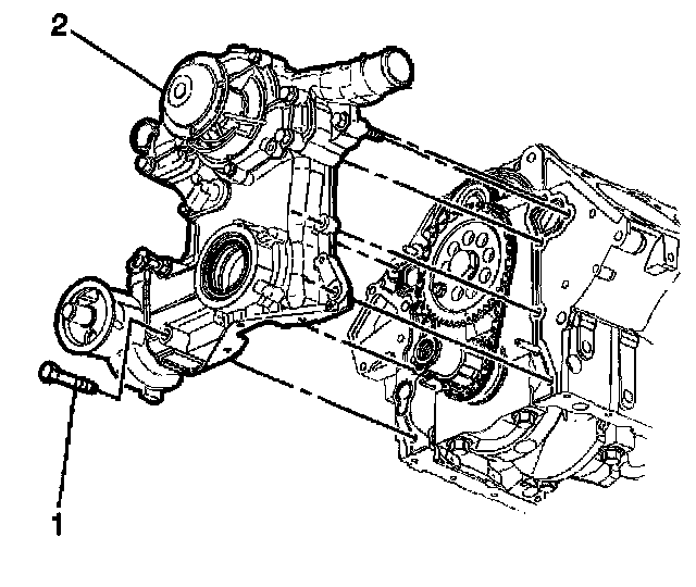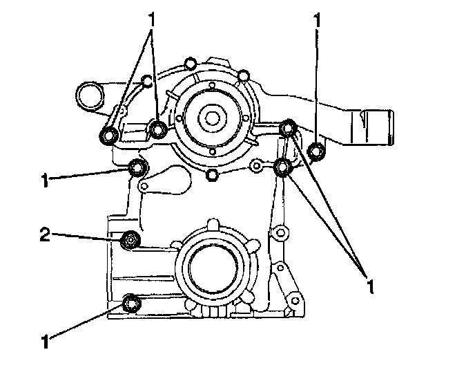 10. Apply sealant GM P/N 12346004 or equivalent to the engine front cover bolts (1) and stud (2).