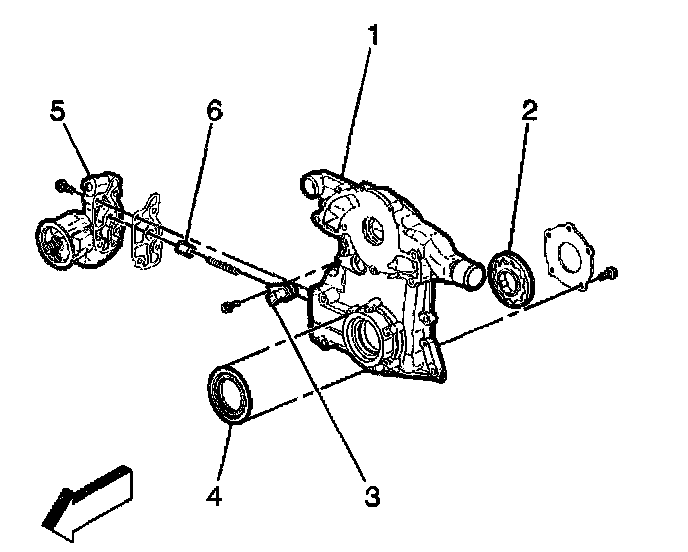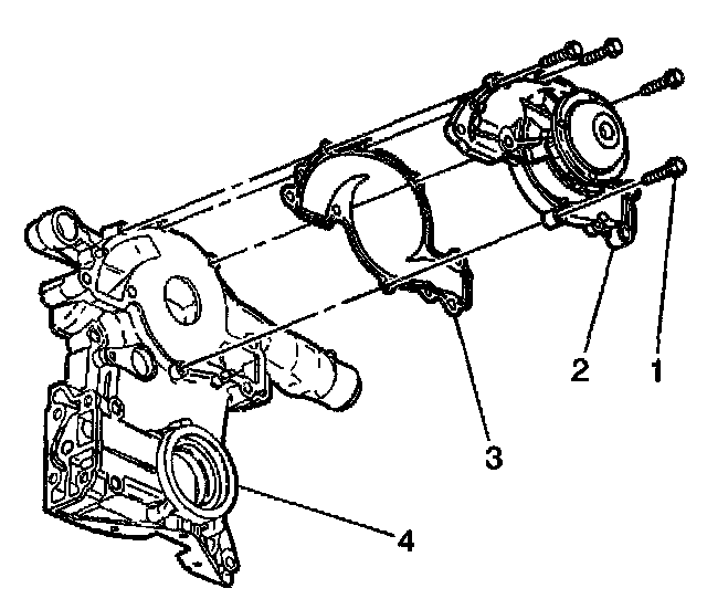 31. Remove the coolant pump gasket (3) from the front cover (4).