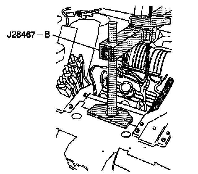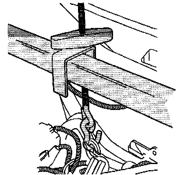 16. Adjust the radiator shelf tube (J 28467-2A) and the assembled lift hook bracket (J 28467-6A) in order to align the hook with the left (front), rear of engine, lift hook bracket attached to the left (front) exhaust manifold.