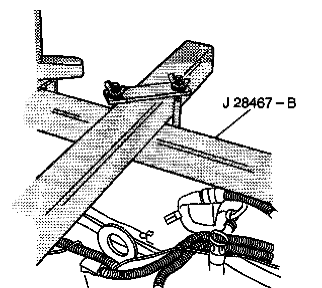 15. Install the assembled lift hook bracket (J 28467-6A) over the radiator shelf tube (J 28467-2A).