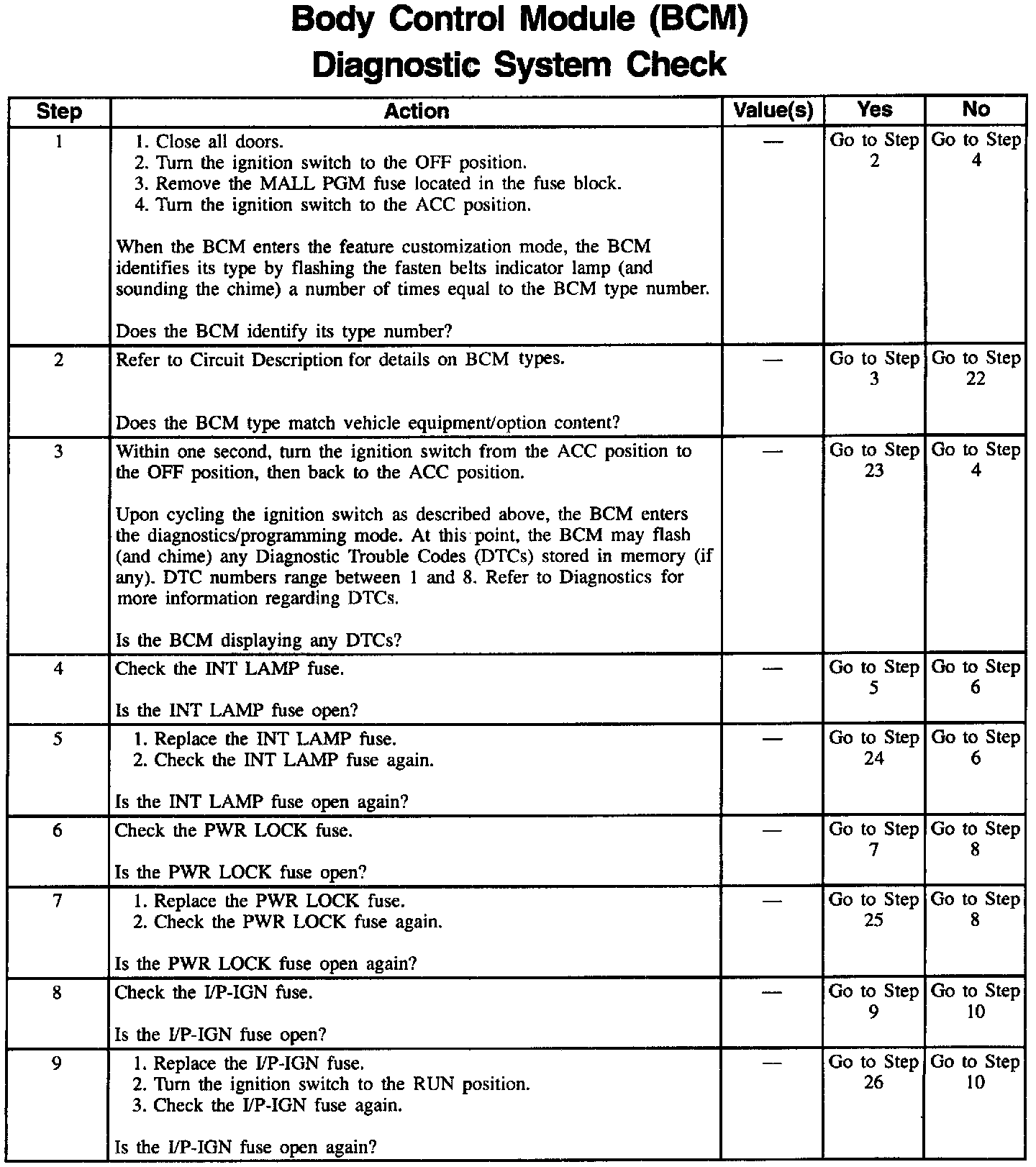 The Body Control Module (BCM) Diagnostic System Check is an organized approach to identify problems associated with the BCM. This check must be the starting point for any BCM complaint, and will direct you to the next logical step in diagnosing the complaint. The BCM is a very reliable component and is not likely the cause of the malfunction. Most system complaints are linked to faulty wiring and connectors, and occasionally to components. Understanding the computer system and using the tables correctly will reduce diagnostic time and prevent unnecessary parts replacement.