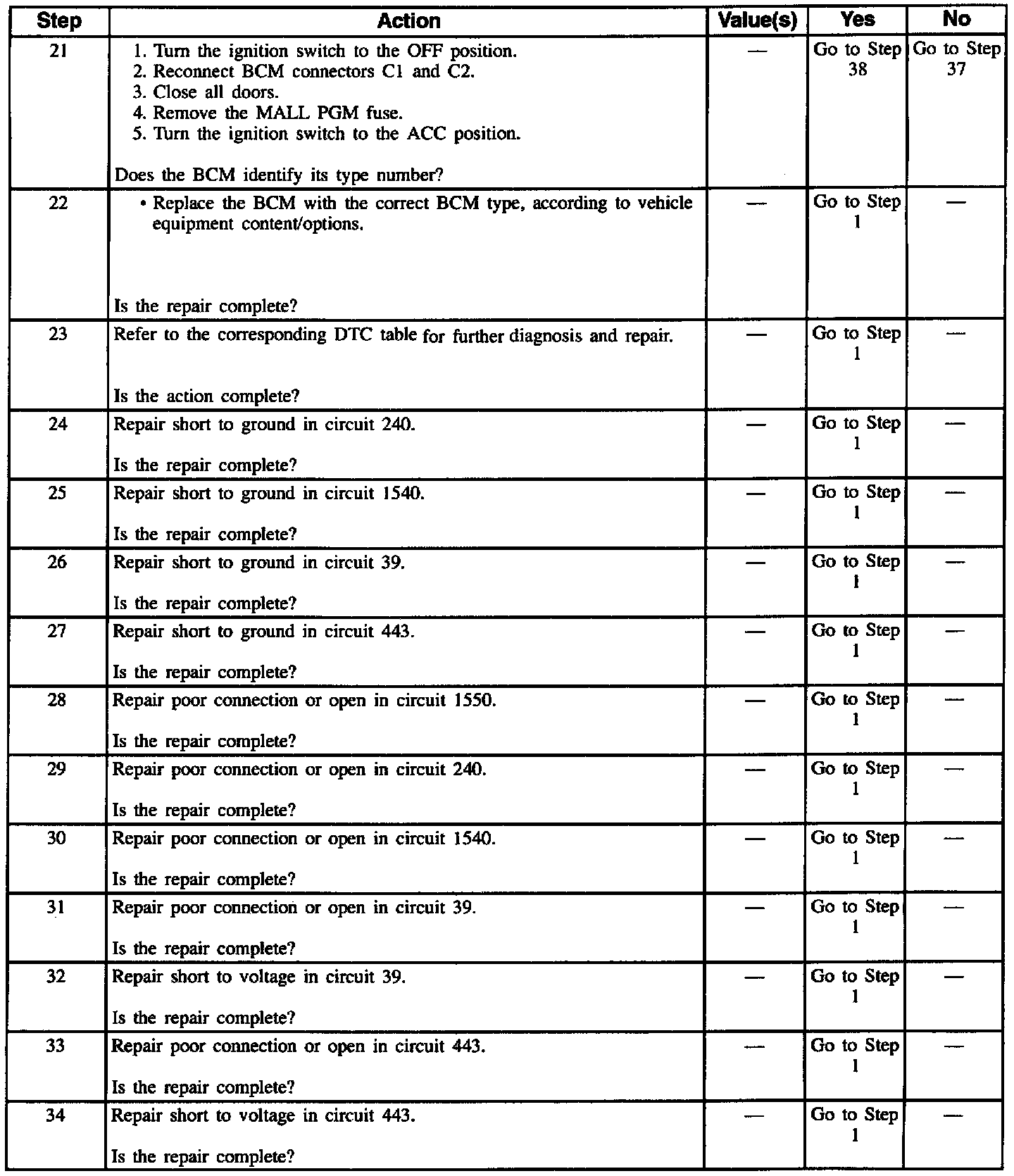 ^ An intermittent failure in the electronic system may be very difficult to detect and to accurately diagnose. The BCM tests for different malfunctions under different vehicle conditions. For this reason, a thorough test drive is often needed in order to repeat a fault condition. If the system malfunction is not repeated during the test drive, a good description of the complaint may be very useful in locating an intermittent fault condition. Faulty electrical connections or wiring causes most intermittent problems. When an intermittent condition is suspected, check the suspected circuits for the following conditions: