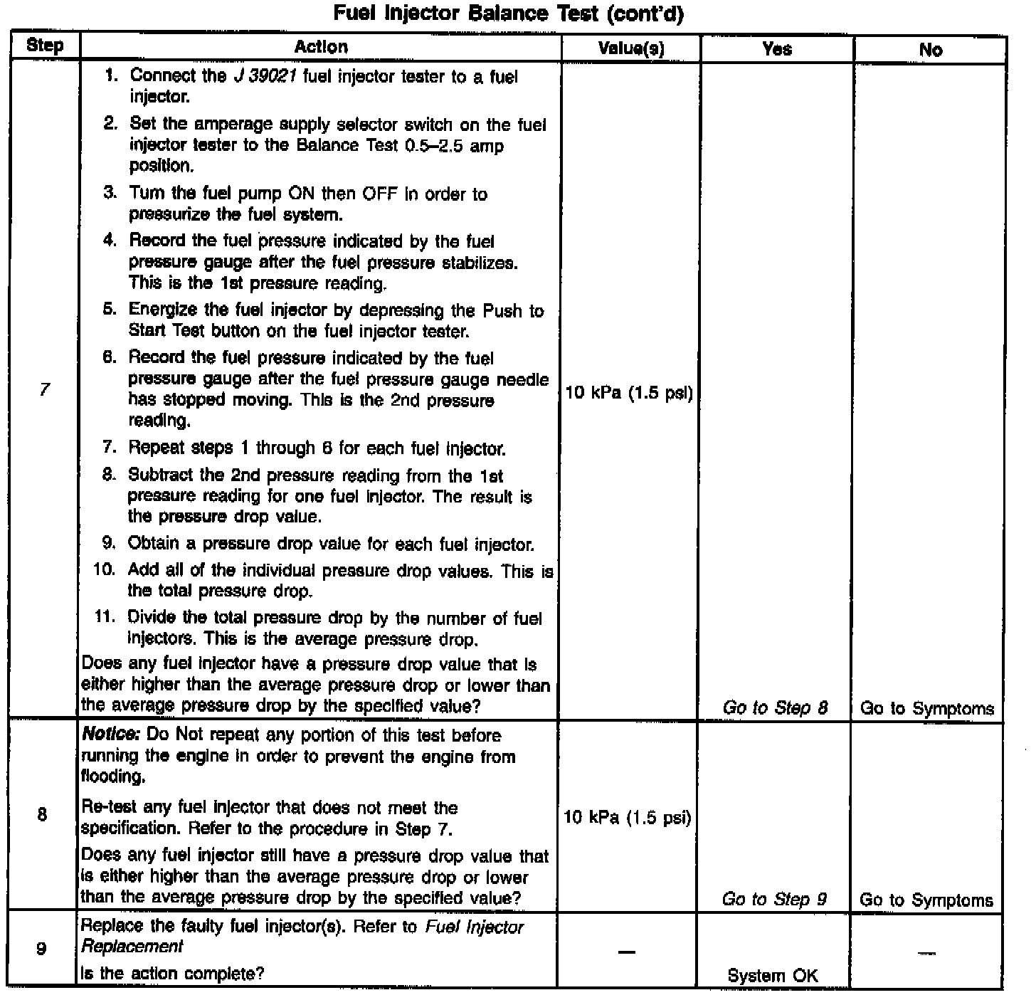7. If the pressure drop value for each fuel injector is within 10 kPa (1.5 psi) of the average pressure drop value, the fuel injectors are flowing properly. Calculate the pressure drop value for each fuel injector by subtracting the second pressure reading from the first pressure reading. Refer to the Injector Balance Test Example.