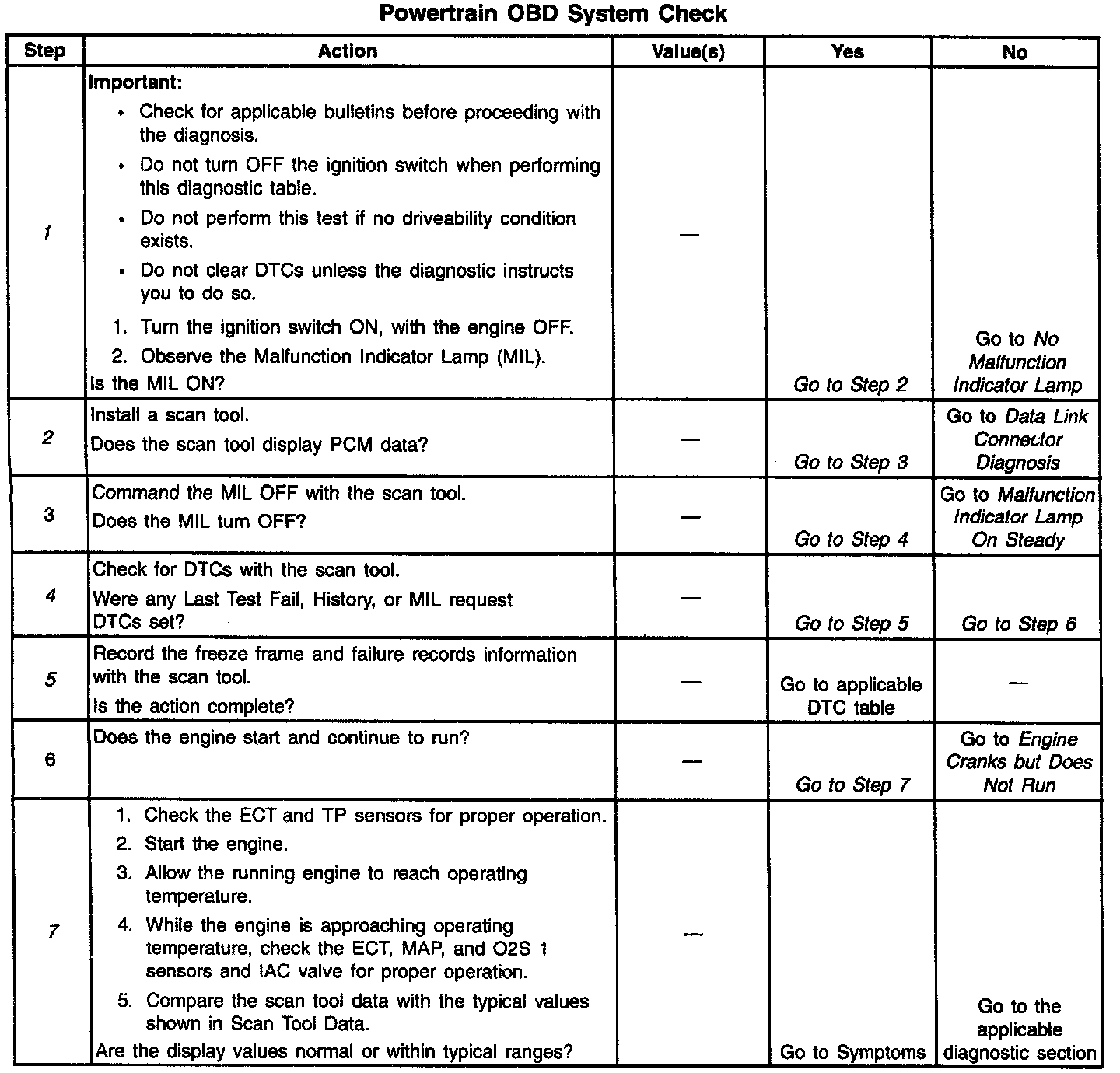 The Powertrain OBD System Check is an organized approach to identifying a problem created by an electronic engine control system malfunction. The Powertrain OBD system check is the starting point for any driveability complaint diagnosis. This directs the service technician to the next logical step in diagnosing the complaint. Do not perform this check it no driveability complaint exists. Understanding the table and using it correctly will reduce diagnostic time, and prevent the replacement of good parts.