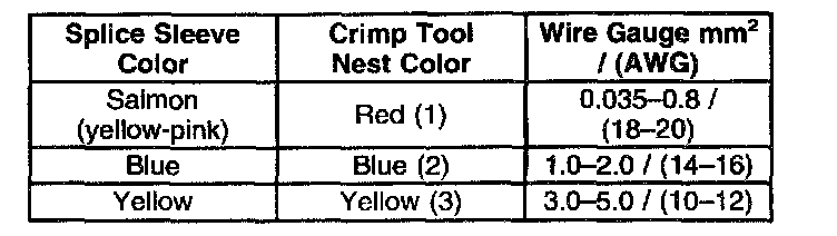 4. Select the proper sealed splice sleeve according to the wire size. Refer to the above table at the beginning of the repair procedure for the color coding of the splice sleeves and the crimp tool nests.