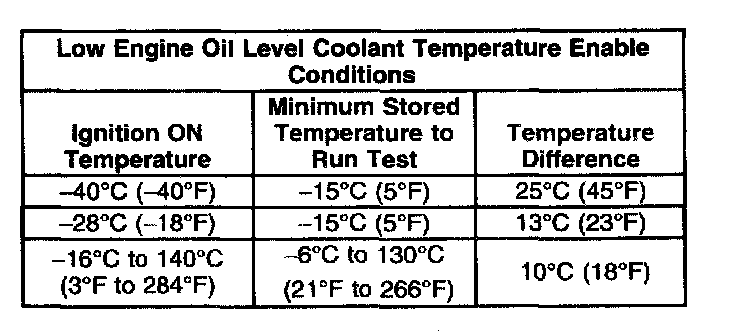 The following table illustrates the required temperatures to enable the Engine Oil Level test: