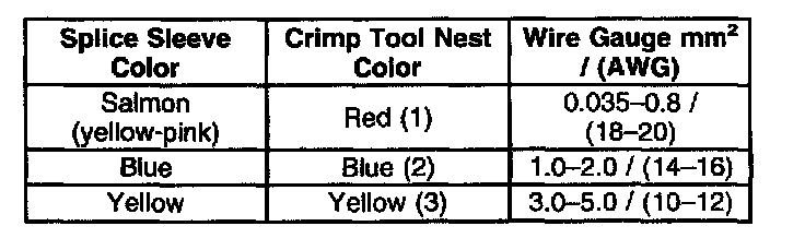 4. Select the proper sealed splice sleeve according to the wire size. Refer to the above table at the beginning of the repair procedure for the color coding of the splice sleeves and the crimp tool nests.