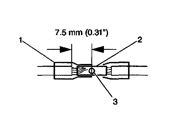 6. Place the splice sleeve in the nest. Ensure that the crimp falls midway between the end of the barrel and the stop. The sleeve has a stop (3) in the middle of the barrel (2) in order to prevent the wire (1) from going further. Close the hand crimper handles slightly in order to firmly hold the splice sleeve in the proper nest.