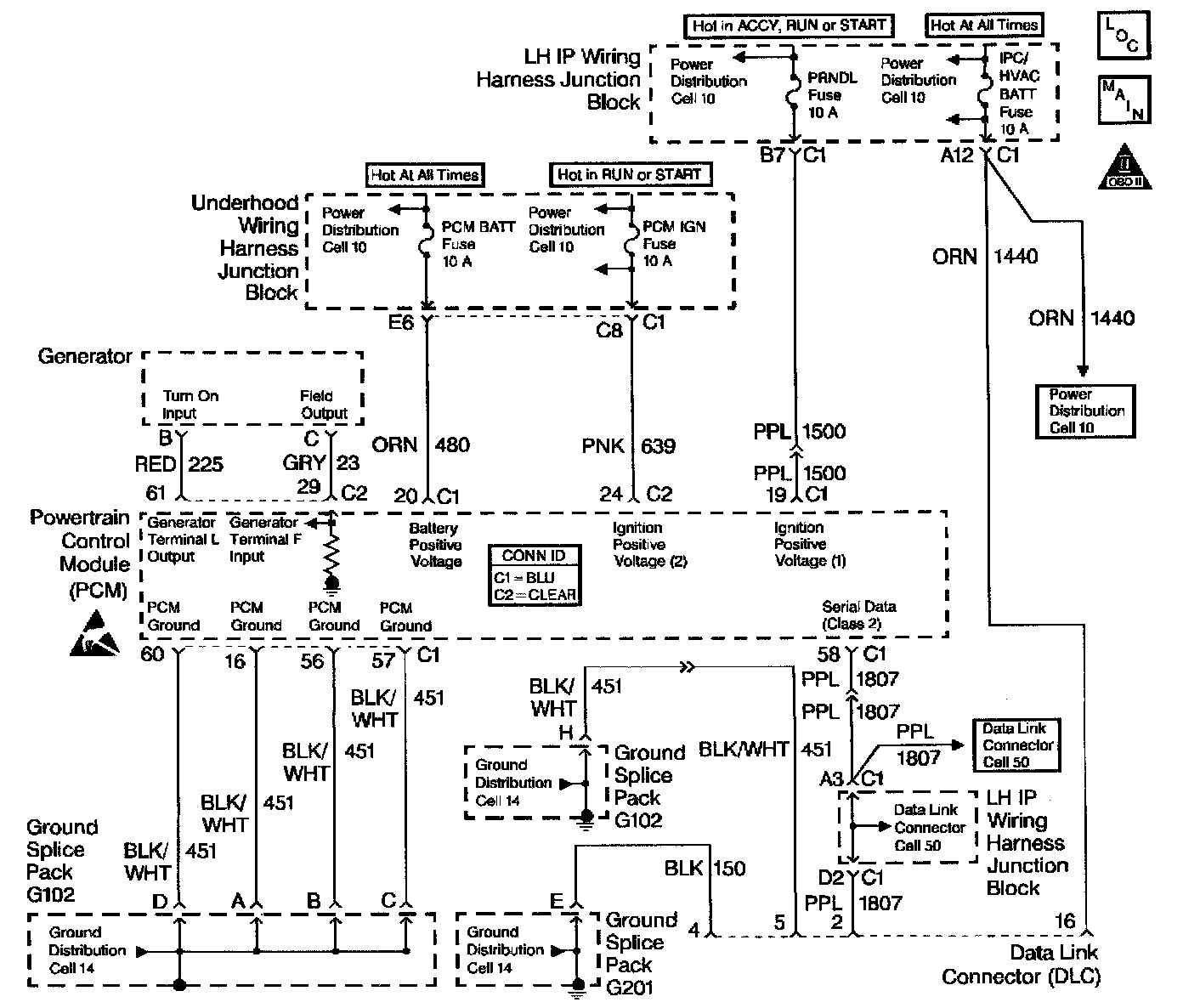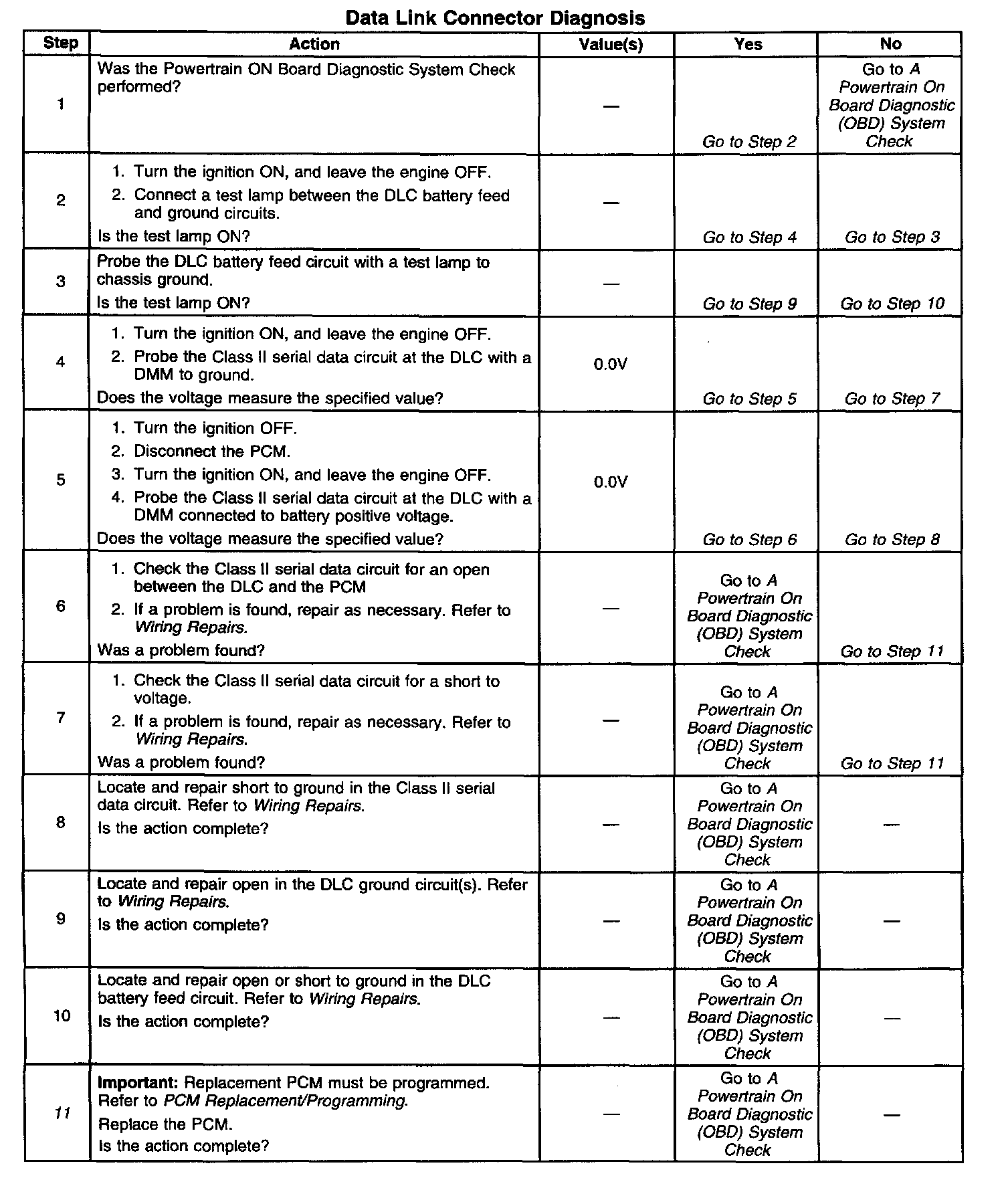 The Data Link Connector (DLC) allows the scan tool to interface with the PCM. The DLC provides the power and ground circuits to enable the scan tool. The Class II serial data circuit to the DLC allows bi-directional communication between the PCM and the scan tool. If communication between the scan tool and the PCM cannot be established, the procedure in the DLC Diagnosis table should be used to diagnose the condition.