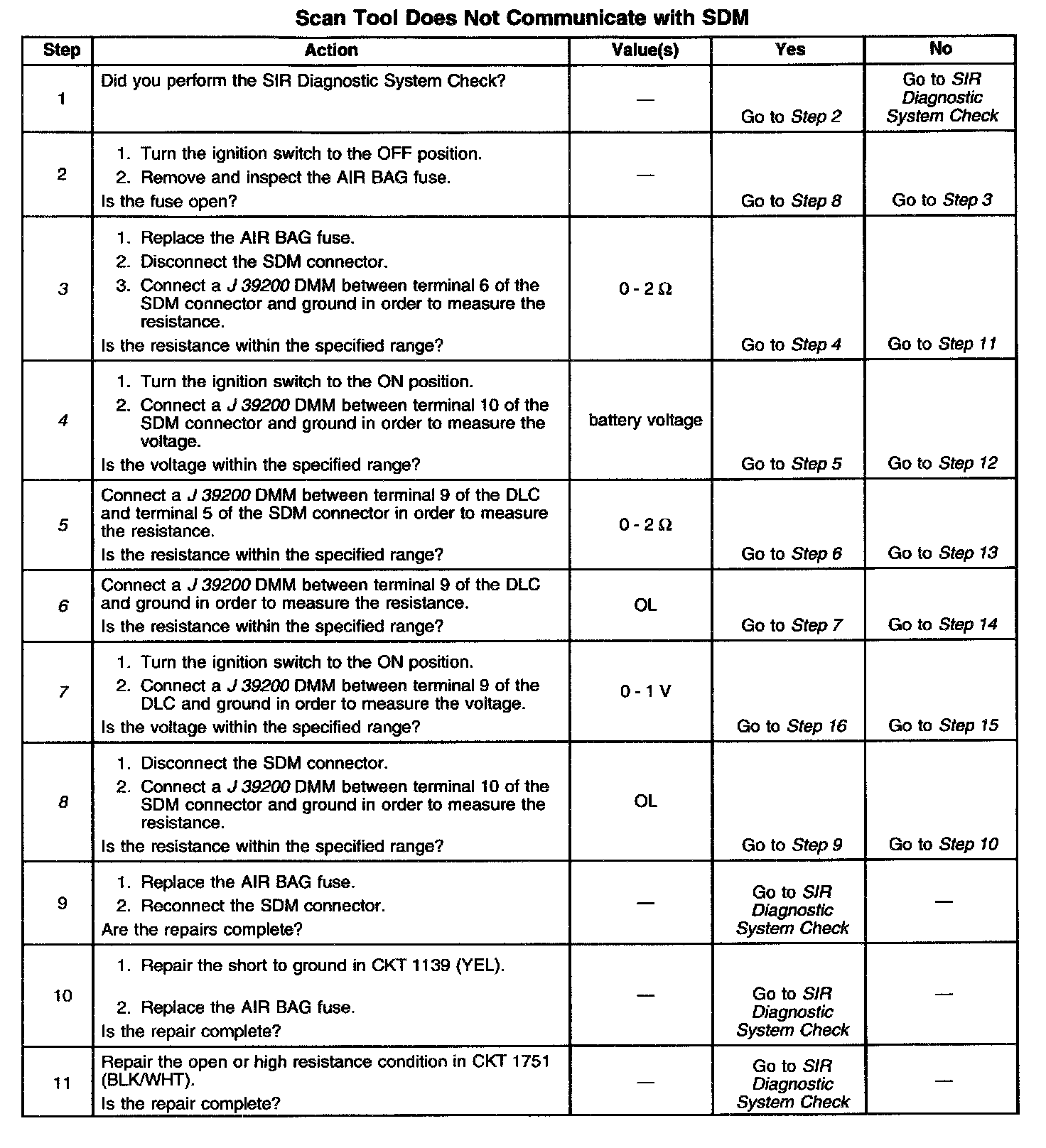 When measurements are requested in this table, use J 39200 Digital Multimeter with the correct terminal adapter from J 35818-A Connector Test Adapter Kit. When a wire, connector or terminal repair is requested, use J 38125-B Terminal Repair Kit and refer to Wiring Repair.