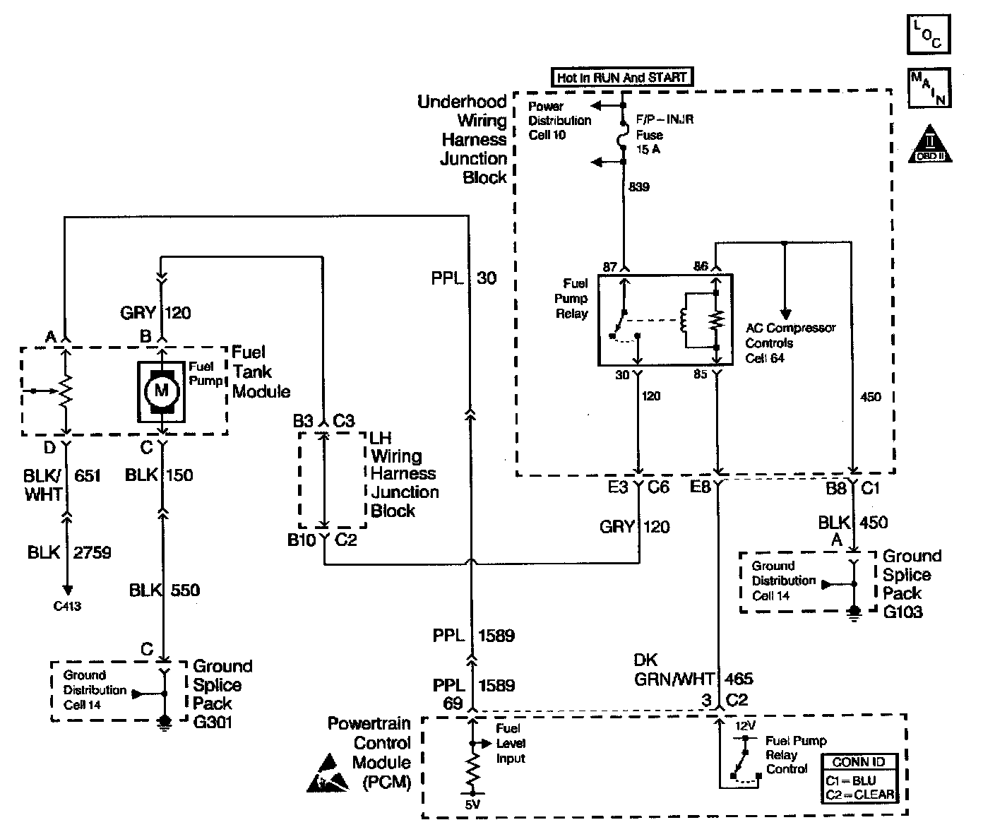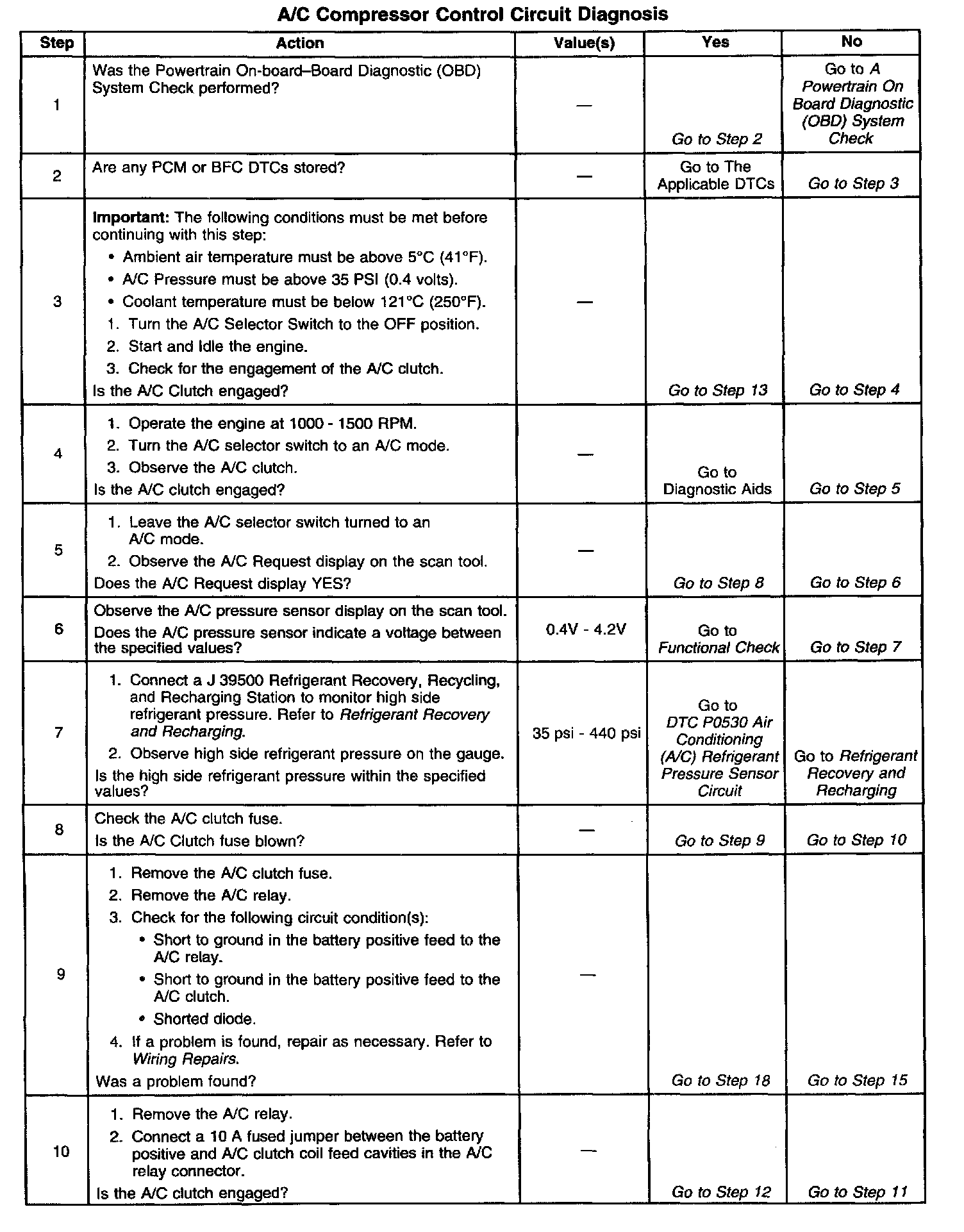 When an A/C mode is selected, the A/C control head or the Body Function Controller (BFC) supplies a signal to the PCM through the Class II Serial Data Circuit. The A/C compressor clutch relay is controlled by the PCM. The PCM provides a ground path for the A/C relay coil. When the A/C compressor relay is engaged battery voltage is supplied to the compressor clutch coil. The PCM will enable the A/C compressor clutch whenever the engine is running and the A/C has been requested unless one or more of the following conditions are present: