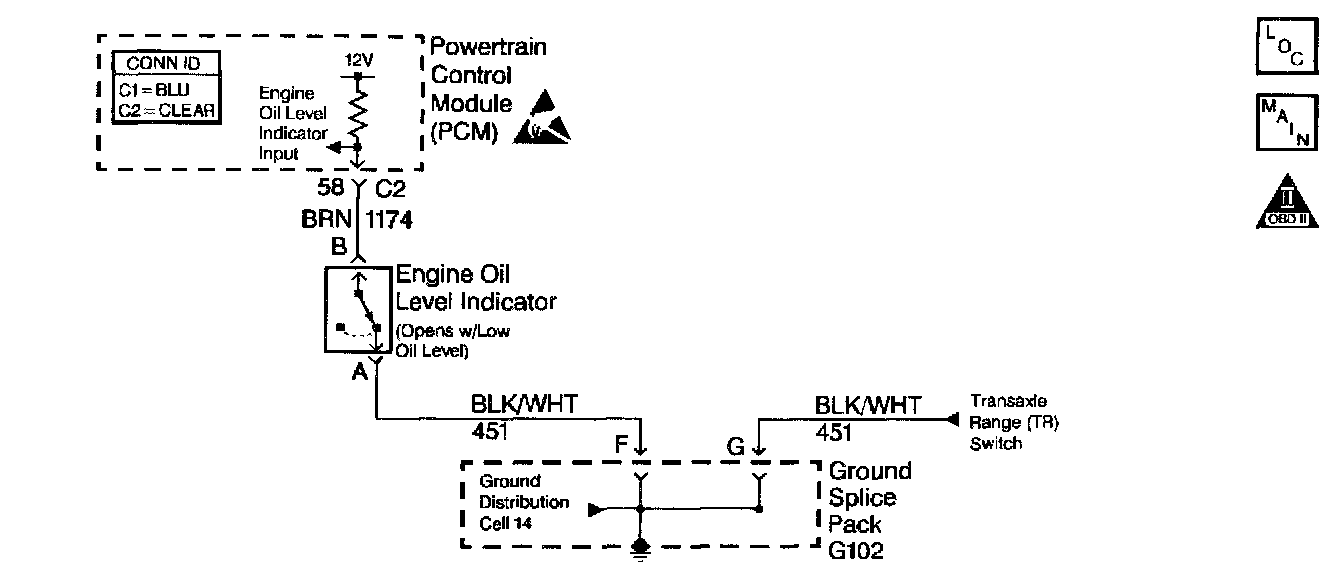 ^ Poor connection at PCM or oil level sensor. Inspect harness connectors for backed out terminals, improper mating, broken locks, improperly formed or damaged terminals, and poor terminal to wire connection.