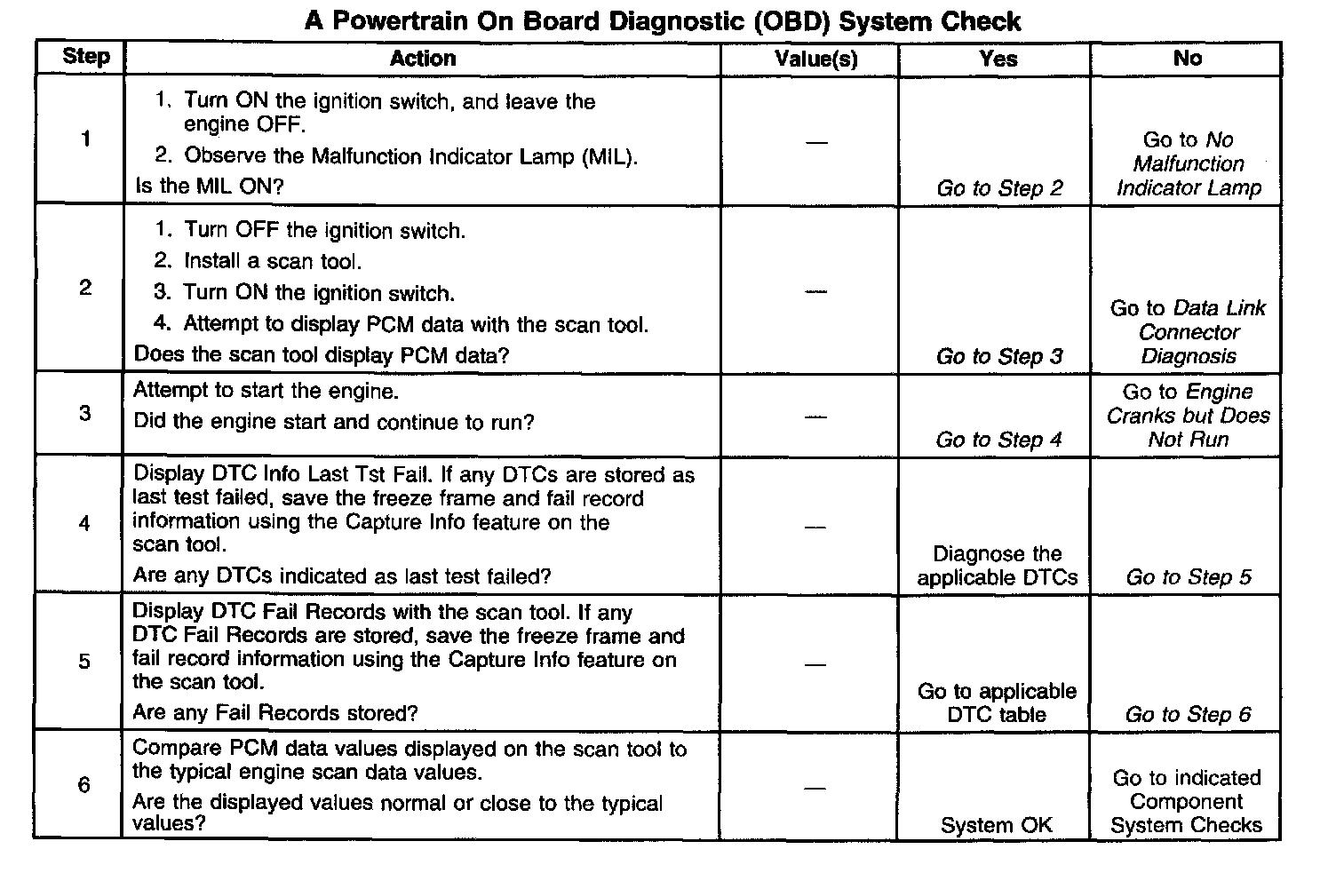 The Diagnostic System Check is an organized approach to identifying a problem created by an electronic engine control system malfunction. The Diagnostic System Check must be the starting point for any driveability complaint diagnosis. The Diagnostic System Check directs the service technician to the next logical step in diagnosing a complaint. Do not perform this check if no driveability complaint exists. Understanding the table and using it correctly will reduce diagnostic time and prevent the replacement of good parts.