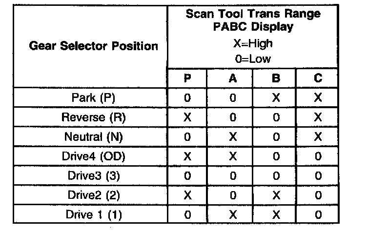 The combination of the four transaxle range input states determine the PCM commanded shift pattern. The input voltage level at the PCM is high (B+ -battery positive voltage-) when the transaxle range switch is open and low when the switch is closed to ground. The state of each input is represented on the scan tool as X=high voltage level, O=low voltage level. The four parameters represent transaxle range switch Parity, A, B, and C inputs respectively.