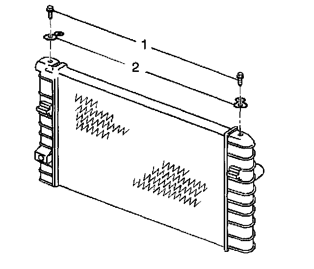 6. Remove the radiator upper mounting bolts (1) and the upper radiator mounts (2).