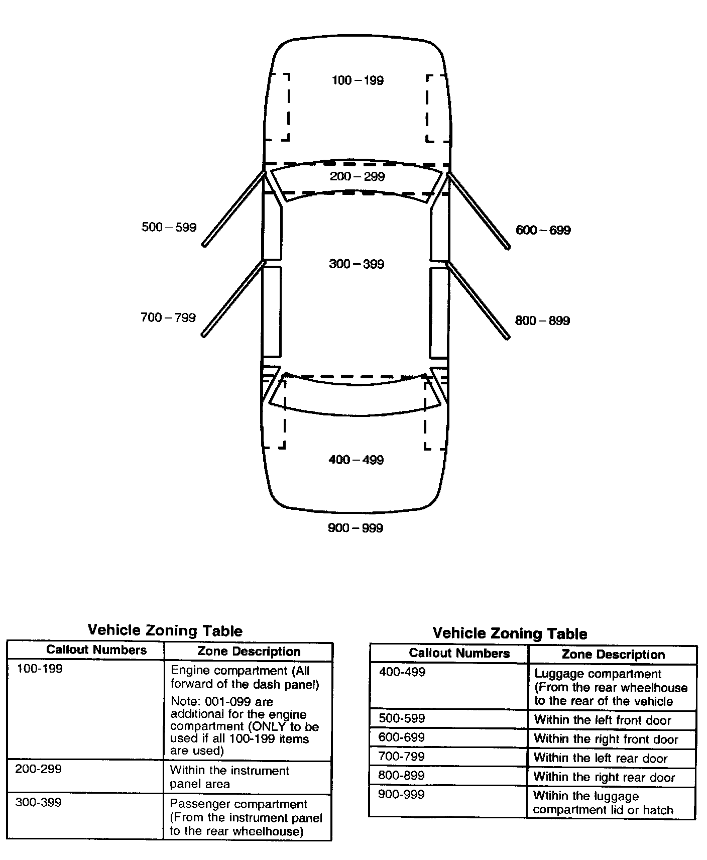 All grounds, in-line connectors, pass-through grommets, and splices have identifying numbers that correspond to where they are located in the vehicle. The following table explains the numbering system.