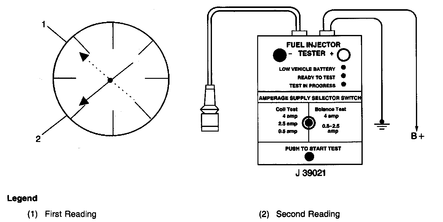 7. If the pressure drop value for each fuel injector is within 10 kPa (1.5 psi) of the average pressure drop value, the fuel injectors are flowing properly. Calculate the pressure drop value for each fuel injector by subtracting the second pressure reading from the first pressure reading. Refer to the illustration.