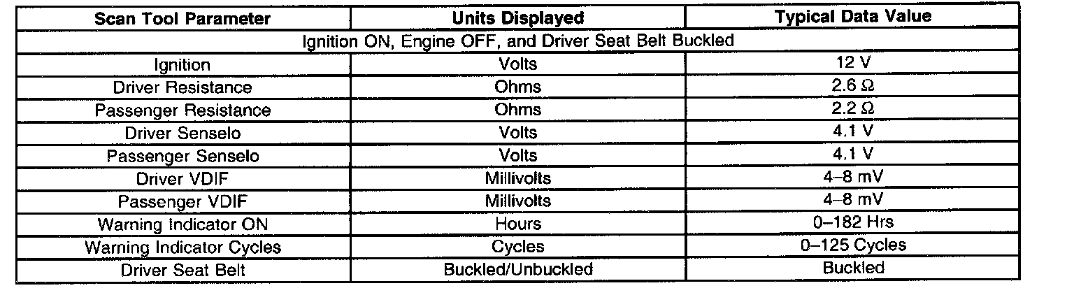 The SIR Scan Tool Data List contains all Restraint related parameters that are available on the scan tool. The list is arranged in the order as they appear on the scan tool.