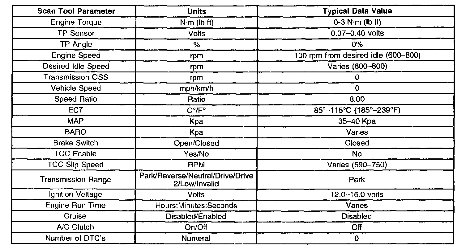 Only the parameters listed below are used in this database for diagnosing. If a scan tool displays other parameters, the values are not recommended by General Motors for use in diagnosis.