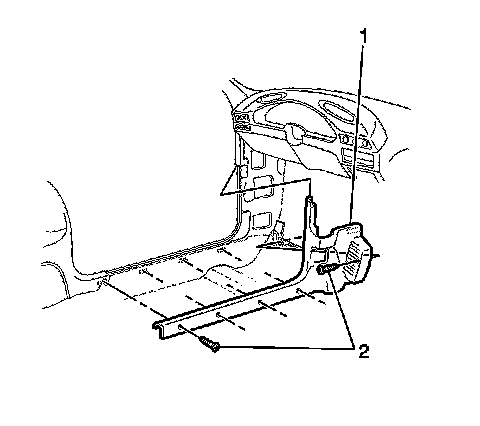 1. Remove the driver-side hinge pillar trim panel bolts/screws (2) from the panel (1).