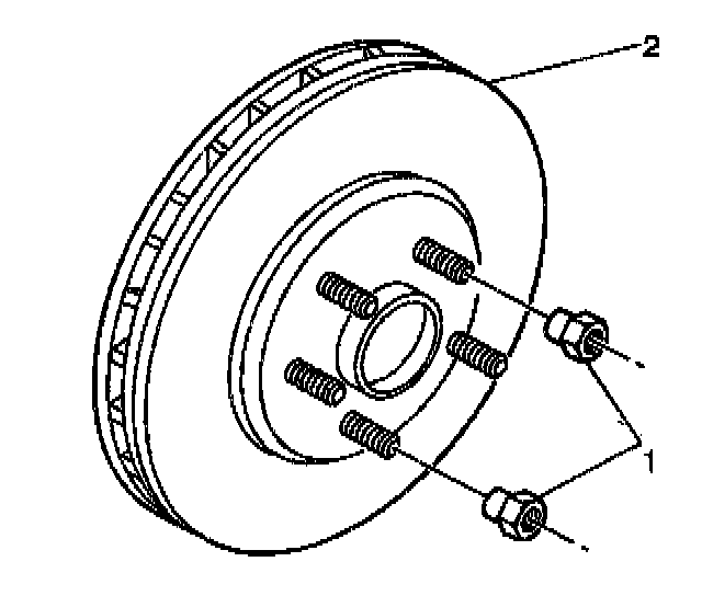 4. Install two wheel nuts (1) in order to retain the rotor (2).