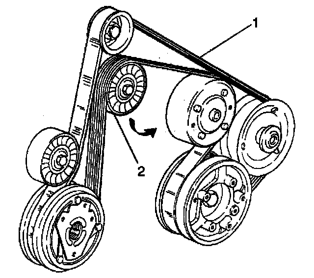 3. Remove the drive belt (1) from the tensioner (2) and pulleys.