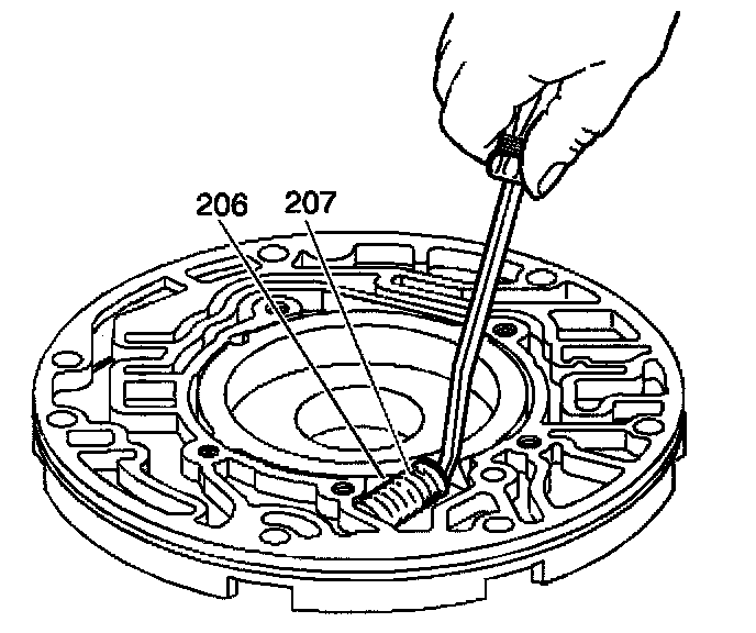 10. Install the bottom pump vane ring (210) and the rotor guide (211) into the rotor (212) and retain with J 36850 or an equivalent.