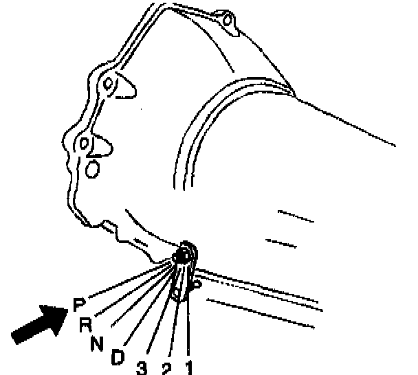 4. Position the transmission range selector lever to park. Rotate the range select lever clockwise until it reaches the full mechanical stop position.
