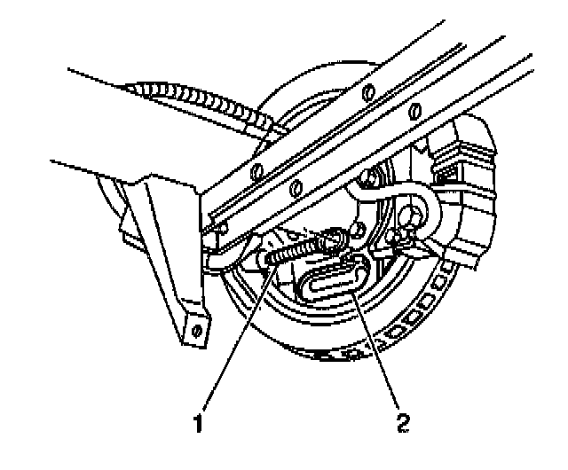 Removal Procedure1. Unhook the rear cable eyelet (1) from the park brake actuator lever (2).