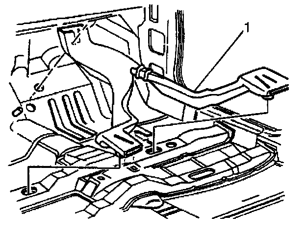 2. Release the rear floor air outlet duct (1) from the studs and the holes in the floor reinforcement.