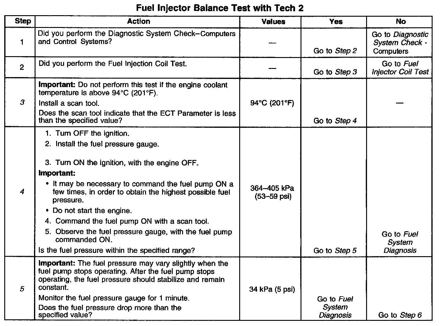 4. The fuel pressure should be within the specified range Refer to Fuel System Diagnosis if the fuel pressure is not within the specified range.